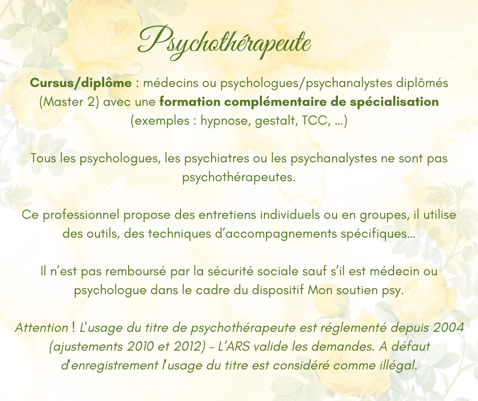 Difficile de s’y retrouver au milieu de tous ces titres. Je tente de résumer l’information dans l’illustration ci-joint. Ce n’est pas exhaustif et n’hésitez pas à demander à votre praticien son cursus, ses formations, etc.